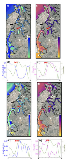 Our analyses show a decrease in the M2 tide amplitude and an amplification in the phase when the wave penetrates through the creeks. A critical and complex point from a hydro-morphodynamic point of view appears at MP, where a maximum in the phases of the tide constituents occurs. This location corresponds to the convergence zone of the tidal wave.
