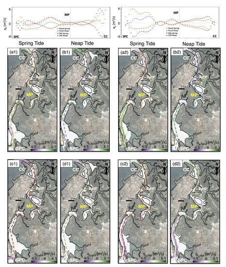 Figure 7 shows the magnitude and spatial distribution of the flow rates (, panels a and b), and , panels c and d) along the x and y coordinates (across and along the channel, respectively), during flood and ebb, for spring and neap tides. Maximum values of and are observed for spring tides (first and third column) within the channel, whereas, over the tidal flats the flow rates are negligible. The east-west component of the velocities (, panels a1–d1—Figure 7) ranges between 6 (flood period) and (ebb period). The maximum value is found at the mouth of CC and SPC. As with the North-South component of the flow rates per unit width (, panels a2–d2—Figure 7), the maximum flood/ebb values are reached at the mouth of SPC (±6), whereas a decrease up to ±3 is observed at the mouth of CC. A strong reduction in both components, and , is observed at MP, where flow rates almost vanish.