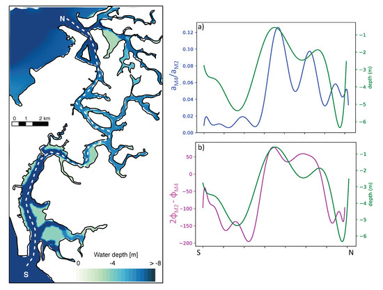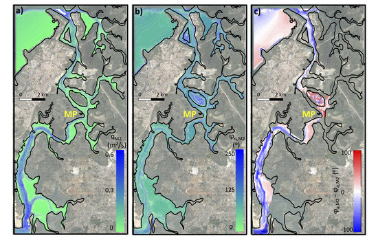 The tidal asymmetry can be addressed by analyzing the ratio between the amplitudes of the M2 and M4 constituents (a/a) (a—Figure 12). This ratio is related to the morphological characteristics and configuration of creeks [96]. [40] showed that estuaries with (1) low freshwater input, (2) significant ratio of tidal amplitude to channel depth, and (3) long narrow channels, the ratio amplitude to tidal asymmetry (a/a) increases as the tide propagates toward the inner estuary. Thus, a larger value of a/a involves a greater relevance of tidal asymmetry. For the SPC–CC system, the minimum values for ratio between amplitudes is observed at the mouth of both creeks (≈0.02 at SPC and ≈0.04 at CC), whereas the maximum is obtained at MP (≈0.12) where the effect of the tidal asymmetry is stronger and areas of significant deposition were found (Figure 11). The relationship between hydrodynamic and morphodynamic variables was shown by [17], where the highest values of a/a corresponded also with an increase of sedimentation.