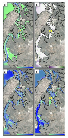 Figure 9 shows the tidal ellipse parameters of the M2 constituent, namely the semi-major axis (a), the semi-minor axis (b), the inclination of the semi-major axis (c) of the ellipse, and the Greenwich phase (d). The semi-major axis (a—Figure 9) decreases towards MP from to and its phase (d—Figure 9) decreases from to . The sharp reduction in M2 currents indicates that bottom friction exerts a large drag on the major astronomical tidal wave entering this shallow creek. The semi-minor axis of M2 (b—Figure 9) exhibits values close to 0. The motion of the tidal flow velocity is almost rectilinear in the main channel of both the creeks, so the semi-minor axis of the flow ellipse is smaller than the semi-major axis. However, important changes in the direction of the rotation of the ellipse are observed (a positive value indicates a cyclonic or anti-clockwise rotation) at both the mouths and in the proximity of the tidal flats due to the water depth changes. Figure 9c represents the inclination of the ellipse; the patchy areas corresponding to areas (tidal flats) where the magnitude of semi-minor axis increases. These areas can be related to the presence of circulation cells and the production of vorticities due to the change in water depths.