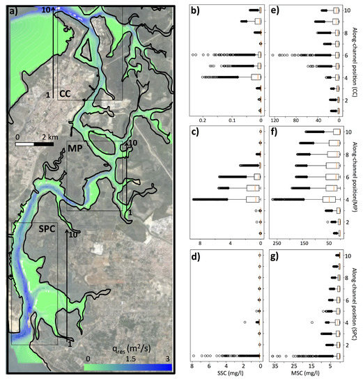(a) Color coded representation of the residual flow magnitudes () at maximum flood period. The sand suspended concentration (; panels (b–d)) and the mud suspended concentration (; panels (e–g)) are shown for 3 cross-sections (North, central and south, defined in panel (a). Vertical axes on panels (b–g) refer to the along-channel position of 10 points equally distributed along the areas highlighted in panel (a).