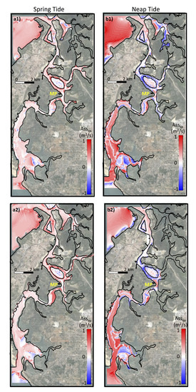 with . This tidal asymmetry ratio was computed along the creeks considering either spring or neap tides (Figure 14). The color-coded representation of the asymmetries suggests that the largest changes of the flow rates per unit width occur during neap tides, whereas asymmetries vanish during spring tides. The ebb dominance prevails at MP and CC for neap tides (blue color in panels b1–b2 in Figure 14). However, the flood dominance prevails at SPC (red color in panels b1–b2 in Figure 14).