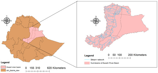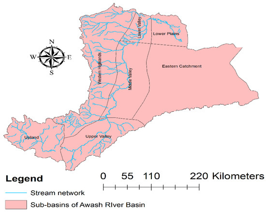 As for the land uses, more than 50% of the land is agricultural, around 39% is covered by grassland and shrubs, and the remaining area is other land uses [6]. Based on interrelated locational, climatic, topographic, agricultural, and administrative factors, the basin has been divided into the upper, the middle, and the lower Awash River Basin [4]. However, hydrologically the basin is divided in to seven main sub-basins (Figure 2). The sub-basins are the Upland (11,229 km2), Upper Valley (13,063 km2), Western Highlands (25,776 km2), Middle Valley (16,259 km2), Eastern Catchment (39,347 km2), Lower Valley (4214 km2), and Lower Plain (6485 km2) (Figure 2). According to Adeba et al. [6], the western 64,000 km2 of the basin generates nearly the entire flow in the basin. The high-stream distribution and density in the western side of the basin (Figure 2) also indicate the relatively high contribution of runoff by the western side of the basin. The maps from Figure 1 to Figure 3 are based on GIS files from Ministry of water resources of Ethiopia and World Bank Groups (https://datacatalog.worldbank.org/dataset/resource).