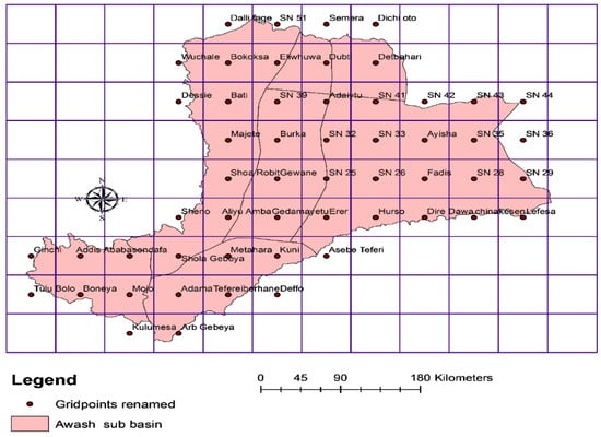 Then, the rainfall data were extracted from the dataset for 54 data points, which are selected by including one point from each grid (0.5 by 0.5 degree) covering the entire basin as shown in Figure 3. The R-Statistical Software version 3.5.2 was used to extract the rainfall data from NetCDF file of the CRU dataset. The Geographic information system (GIS) software package was also used in developing the 0.5 by 0.5 degree- grid, mapping, site selection, and in estimating corresponding areas for each grid point. The monthly data at all data points were area-weighted averaged to get areal rainfall for respective sub-basins and the entire basin, following the suggestion by Cheung et al. [1] for trend analysis at practically meaningful spatial scales; this approach was used in similar studies [1,15,34]. Then, the annual and seasonal time series were created from the monthly areal-rainfall data by aggregating the monthly data using R-software.