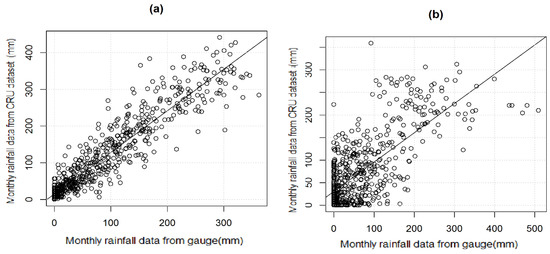 The scatter plots of observed versus CRU precipitation at two selected gauge stations: (a) Addis Ababa, and (b) Adama.