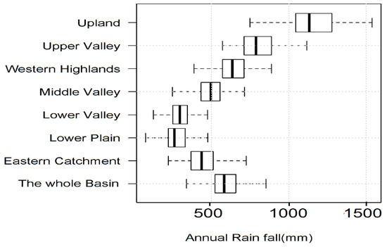 The summary statistics for annual rainfall time series (1901 to 2016) show that the minimum, mean, and maximum annual rainfall over the sub-basins range from 36.3 to 748.6 mm, 276.5 to 1155.2 mm, and 579.6 to 1538.1 mm, respectively. Similarly, the first quarter, median, and third quarter of annual rainfall vary from 221.4 to 1044.8 mm, 261 to 1132.5 mm, and 330.1 to 1277.1 mm, respectively. All lowest values of the statistical parameters are found at the Lower Plain, while the corresponding highest values are found at the Upland Catchment. On the basin level, the minimum, mean, and maximum annual rainfall over the sub-basins are 312.7, 588.8, and 915.2 mm, respectively (Figure 5).