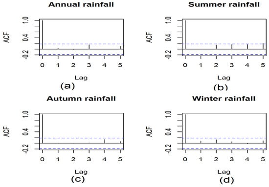 The ACF plots for annual (a) and seasonal rainfall (b–d) time series for the entire basin.