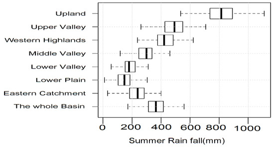 The summary statistics for summer rainfall time series (1901 to 2016) show that the minimum, mean, and maximum annual rainfall over the sub-basins range from 10.5 to 417.7 mm, 159.1 to 818.9 mm, and 458.4 to 1160.8 mm, respectively. Similarly, the first quarter, median, and third quarter vary from 104.5 to 738.1 mm, 148.2 to 813.8 mm, and 184.7 to 888.6 mm, respectively. All lowest values of the statistical parameters are found at the Lower plain, while the corresponding highest values are found at the Upland catchment. On the basin level, the minimum, mean, and maximum annual rainfall over the sub-basins are 171.7, 368.5, and 727.7 mm, respectively (Figure 9).