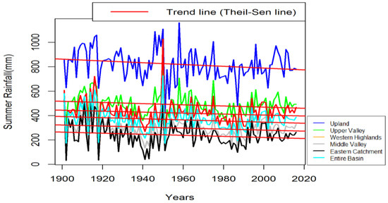 The annual rainfall shows no significant change over the 116 years in all sub-basins and over the entire basin. However, trends of seasonal rainfall are different across study areas. The summer rainfall showed significant decreasing trends (α ≤ 0.1) over five sub-basins at rates varying from 4 to 7.4 mm per decade, but showed no trend over two sub-basins—the Lower Valley and Lower plain. The autumn rainfall showed no significant trends over four sub-basins but showed increasing trends over three sub-basins (Lower Valley, Lower plain, and Eastern Catchment) at a rate varying from 1.9 to 5 mm per decade. The winter rainfall showed no significant trends over four sub-basins but showed significant increasing trends over three sub-basins at a rate varying from 0.6 to 2.7 mm per decade. The rate of change is generally highest in summer rainfall, followed by autumn rainfall. The winter rainfall showed the least rate of change over the period (1901 to 2016). On the basin level, summer rainfall has shown significant decreasing trend (α = 0.05), while autumn and winter rainfall have showed no a significant trend.