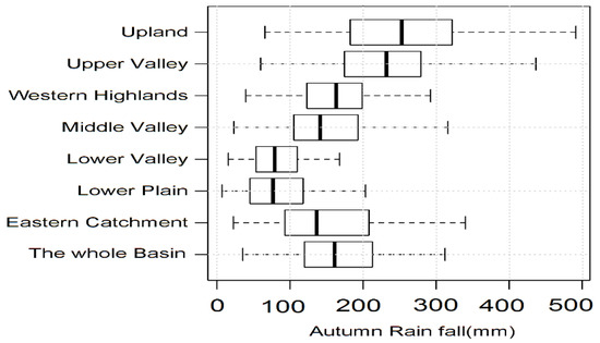 The summary statistics for autumn rainfall time series (1901 to 2016) show that the minimum, mean, and maximum annual rainfall over the sub-basins range from 7.1 to 65.7 mm, 83.59 to 260.7 mm, and 168.2 to 589.3 mm, respectively. Similarly, the first quarter, median, and third quarter vary from 46.6 to 182.6 mm, 76.75 to 252.8 mm, and 109.42 to 320.8 mm, respectively. All of the corresponding highest values of the statistical parameters are found at the Upland catchment, while the lowest values are found in the Lower plain and the Lower valley. At the basin level, the minimum, mean, and maximum autumn rainfall over the sub-basins are 35.7, 167, and 363.4 mm, respectively (Figure 11).