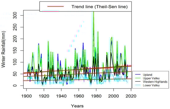 For the winter season, in all sub-basins, except in Upland, Western highlands, and Upper Valley, no significant trend was identified. Similarly, no significant trend was identified for the entire basin, whereas a significant increasing trend was identified at α = 0.05 in the Upland and Western highlands and at α = 0.1 in the Upper Valley (Table 6). Thus, the winter season rainfall in the Awash River Basin can generally be characterized by either increasing or no trend. As for the rate of change, the winter season rainfall rises by 1.2 mm per decade at the basin level and by a rate varying from 0.6 to 2.7 mm per decade across the sub-basins (Table 6). Figure 14 shows the plot for winter rainfall and trend line for time series, showing significant increasing trends.
