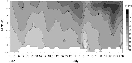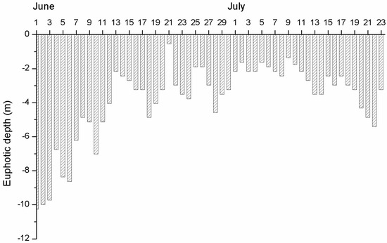 Maximum daily PAR was measured on 26 June and 8 July (Figure 2), and measured 1161 and 1172 μmol·s−1 m−2, respectively. However, the instantaneous maximum occurred between 11:00–12:00 on 23 June, when it measured more than 2420 μmol·s−1 m−2. The PAR fluctuation was not remarkable, except on 7–9 June, 20–22 June and 22 July, when the PAR was less than 300 μmol·s−1 m−2. The euphotic zone was very deep at the beginning of the study period and became shallower after 11 June (Figure 2). The average euphotic depth was 3.83 m (range: 0.54–10.26 m), and it typically ranged between 2 and 5 m. The surface water temperature in Xiangxi Bay fluctuated between 23.06 and 30.75 °C and generally exceeded 25 °C. Stratification was evident, especially when the water temperature increased (Figure 3).