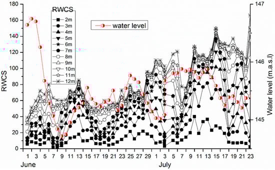 Corresponding to the water stratification, the RWCS increased as the stratification became more evident (Figure 4). The RWCS of the upper water column was much lower than that of the whole water column (12 m), and it showed marked fluctuations, implying frequent water exchange in the upper water column. The RWCS was much lower before 9 June, especially that of the upper water column, due to the continuous dramatic water level decrease. The RWCS in different depths showed that a mixing event happened in 8 and 9 June, with very low RWCS values in the upper 7 m water column. From 10 June, RWCS gradually increased as the water level increased and reached a peak on 14 June; however, the increase in the magnitude of the 2 m RWCS was very small. Subsequently, several obvious fluctuations were observed. In most cases, the increase or decrease in RWCS was accompanied by an increase and decrease in water level.