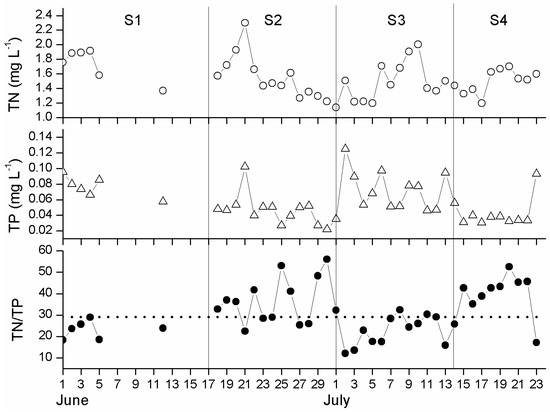 The research of Smith indicated that cyanobacteria tend to be dominant in low TN/TP ratio waters [35]. TN/TP ratios greater than 29 limit cyanobacterial dominance. Therefore, in this study, the whole survey period was divided into 4 stages according to a TN/TP ratio of 29: S1 (1–17 June); S2 (18 June–1 July); S3 (2–14 July); and S4 (15–23 July). Among the 4 stages, weekly monitoring of the water chemistry was performed from 6 to 17 June during S1; we considered this time period as one stage according to the overall changing trend of the TN/TP ratio.