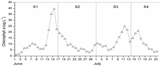 Figure 6. Variations in the daily average Chl a concentration in Xiangxi Bay from 1 June to 23 July 2008. S1–S4 were divided according to the value of TN/TP = 29. S1: TN/TP < 29, S2: TN/TP > 29; S3: TN/TP < 29; S4: TN/TP > 29.