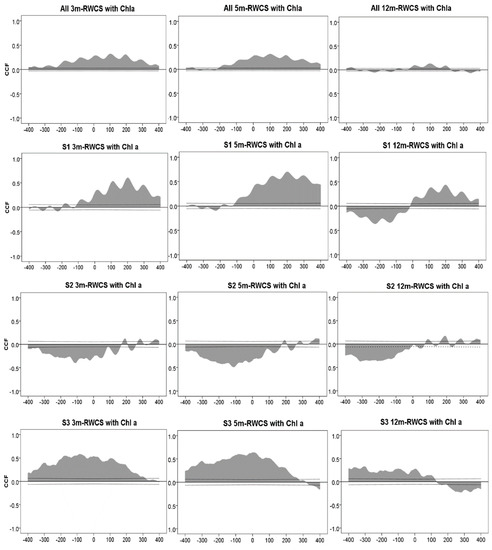 Cross-correlation analysis was carried out between the RWCS above specific depths and the Chl a concentration measured in different stages (S1–S4 and the whole period). We extracted the highest CCF and the relative lag number (Table 1).