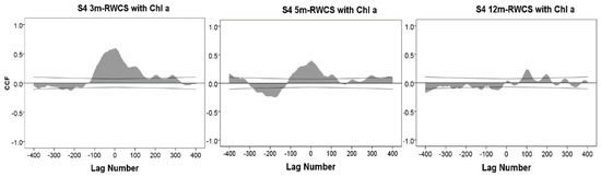 Because the effects of the RWCS above the 3- and 5-m water columns were usually the most prominent, we showed the relationships between the 3-m RWCS and Chl a, 5-m RWCS and Chl a, and 12-m RWCS and Chl a in different stages (S1–S4 and the whole period (All)) (Figure 7). It was evident that the CCF was much lower when all data were analyzed (the first row). Different relationships were obtained at different stages. In S1 and S3, the concentration of Chl a showed periodic fluctuation. In S4, no periodic changes were observed because the Chl a concentration decreased over a short period of time, and therefore, the CCF was also not periodic.