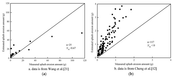 Comparison between the predicted and measured values of the splash erosion amount. (a) Data are from Wang et al. [21]; (b) data are from Cheng et al. [12].