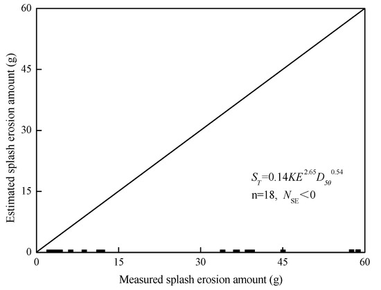 When the splash distance was the same (Table 2), the splash erosion amount increased with increasing raindrop energy. The splash erosion amount of the raindrop energy 22.4 × 10−5 J m−2 s−1 was at a maximum and was significantly higher than that of the other raindrop energies, which were 1.1–27.3, 2.3–20.0, 2.7–15.0, 2.7–10.9, and 3.1–6.7 times that of the other splash distances, respectively. The regression analysis showed that for the same splash distance, the splash erosion amount M had a power function relationship with the raindrop energy E (Table 4). These results were consistent with those of Hu et al. [20], Rose [35], Parsons et al. [36], and Fernándezraga et al. [37] and showed that the impact of the raindrop was enhanced by an increase in the raindrop energy, which then promoted the separation and transportation of more soil particles. The index value of the relationship between the total splash erosion amount and the raindrop energy was 1.42. This value was close to the index value of 1.46 from the study of Free [15]. However, Hu et al. [20] showed that the total soil splash erosion amount was a power function with increasing raindrop energy in the black soil area of the northeast Chinese mollisol region under rainfall intensities of 50 mm h−1 and 100 mm h−1: Moreover, the index values were 2.79 and 1.69, respectively, which were different from the results of this study. This discrepancy may have been due to differences in the soil organic matter content between black loessial soil (SOM (Soil Organic Matter): 1.55%) and the black soil area (SOM: 2.38%), because the soil organic matter content may have affected soil erodibility. The relationship between the splash erosion amount and raindrop energy varied with increasing splash distances, and both the raindrop energy (E) and splash distance (S) affected the splash erosion amount (M). For the M values, E values, and splash distances S that were analyzed using multiple regression, the relationship followed a power–exponential function: , R2 = 0.81, p < 0.05. The data of Wang et al. [21] were placed into the above equation for verification. The ENS value was 0.67 (Figure 2a). It can be seen that the fit was better [34], which may have been because the soil used in Wang et al. [21] was from the Loess Plateau and the rainfall conditions were similar to this study. The data of Cheng et al. [12] were placed into the above equation for verification. The ENS value was less than 0 (Figure 2b). This may have been affected by soil types and slope. The data in this study were placed into the splash erosion model of Hu et al. [20]: ST = 0.14KE2.65D500.54, where ST is total splash erosion (g), KE is raindrop kinetic energy (J m−2 mm−1), and D50 is the raindrop median volume diameter (mm).The results showed that the ENS value was less than 0 (Figure 3), so the model of Hu et al. [20] could not predict the amount of splash erosion in this study, which was mainly affected by soil types and rainfall conditions. The above research further indicated that the model proposed in this study can evaluate soil splash erosion in the Loess Plateau well, but the simulation results of the areas outside the Loess Plateau are still insufficient. Therefore, model correction needs further exploration in future research.