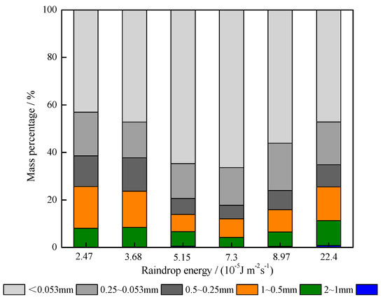 The particle size distribution of splashed aggregates for different raindrop energy levels is shown in Figure 4. For each raindrop energy level, the mass percentage of soil aggregates >2 mm was almost zero, possibly because these aggregates were not sufficient to splash out under the present experimental conditions [25,30]. As a whole, the mass percentage of particle sizes >0.25 mm presented a down up trend with increasing raindrop energy. When the raindrop energy was 2.41 × 10−5 J m−2 s−1, the mass percentage of the water-stable aggregates >0.25 mm was highest, with a value of 39%. When the raindrop energy was 7.30 × 10−5 J m−2 s−1, the mass percentage of water-stable aggregates >0.25 mm in diameter was lowest, with a value of 18%. This outcome may have been due to the smaller raindrop energy condition, in which the raindrop was less effective at soil splash erosion. With an increase in the raindrop energy, the effect of raindrops on soil aggregates was enhanced. Therefore, dispersed soil particles were more likely to be splashed, and some of the splashed aggregates broke into microaggregates (<0.25 mm). Due to the lighter mass of the microaggregates themselves, the quantity of transportation was larger. When the raindrop energy was higher than 7.30 × 10−5 J m−2 s−1, more macroaggregates splashed out, and thus the mass percentage of the macroaggregates (>0.25 mm) increased.