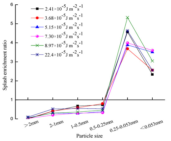 The splash enrichment ratio (ER) for each particle size at the different raindrop energy levels is shown in Figure 5. The enrichment ratio of aggregates presented an up–down trend with decreasing particle size. The ER value for a particle size greater than 2 mm was close to 0. Ma et al. [25] showed that a rainfall intensity of 58.1 mm·h−1 resulted in ER values of 0 for particle sizes of 5–2 mm and a value close to 0 for particle sizes of 2–1 mm, which was consistent with the results of this study. The ER value for particle sizes greater than 0.25 mm was <1, whereas that for particle sizes less than 0.25 mm was >1 for all raindrop energy levels. Thus, the 0.25-mm particle size was the critical particle size level for the enrichment and depletion of splash erosion. However, Zhou [40] analyzed the selective characteristics of splash erosion for black soil aggregates and concluded that aggregates with a particle size >1.0 mm were not easily transported. Hence, a particle size of 1.0 mm was the critical particle level for the enrichment and depletion of splash erosion. This finding was inconsistent with the conclusion of this study, possibly because the soil selected in this study was developed from loess parent material, and the erodibility of the soil was relatively high. Under the condition of raindrop splash erosion, the large particle size was smaller and was easily broken into smaller particle-sized aggregates: Thus, the >0.25-mm macroaggregates were gradually broken into <0.25-mm microaggregates. This result was consistent with that of Legout et al. [28], who proposed that soil aggregates could be hypothesized into a single stratified structure. The macroaggregates (>0.25 mm) were bound by microaggregates (<0.25 mm) and gradually disintegrated into microaggregates during rainfall. The macroaggregates were mainly broken into 0.25–0.053-mm aggregates for all rainfall experiments (Figure 5). Fu et al. [41] considered that the ER value of particle sizes 1–0.053 mm was greater than 1. Aggregates with a particle size >1 mm were mainly broken into aggregates with particle sizes of 1–0.053 mm in the single-raindrop test in that study. That particle size was larger than the results of this study, because the single-raindrop splash soil resulted in less fragmentation of the aggregates [41]. Conversely, in a study with multineedle rainfall, soil particles may receive secondary raindrop splash erosion, and hence more fine particles may be produced.