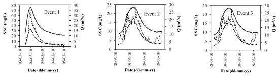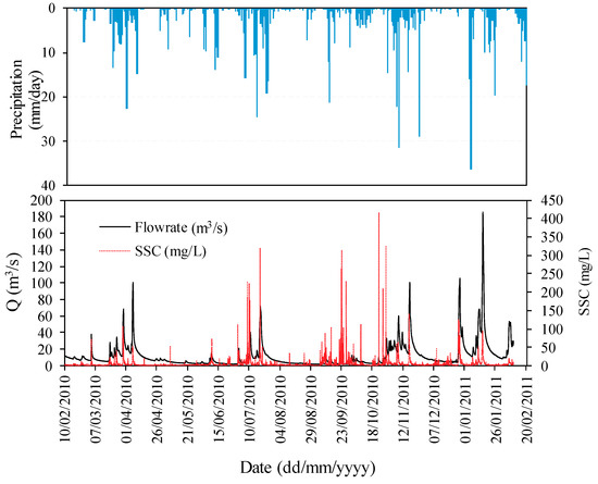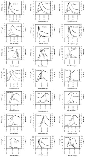The models proposed are used only for the storm event periods, i.e., from once the critical flow is achieved until the flow decreases to approximately Qc again. The independent storm events were considered when the following conditions were achieved: (i) flowrate was greater than the critical flow, Qc, that is, when sediment bed erosion, transport, and fine sediment suspension were observed, as presented in Figure 3; (ii) a peak in the measured suspended sediment concentration was observed; and (iii) the total event suspended sediment during the episode, ESS, >0.5 (tons). This criterion was adopted with the intention of reproducing all the peaks of SSC and, from this, all the volumes eroded by storm events, and understood as those that occur under the above conditions.