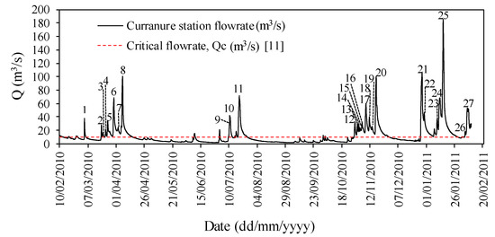 This data was evaluated by Park [11] using a slope–break analysis which proposed that for the River Bandon, the critical flowrate, Qc, should be adopted as 10 m3/s. Flow rates greater than this critical flow give rise to sediment bed erosion, transport, and fine sediment suspension. Visual observation and field experience [18] have shown that the bed load becomes active in the range of 10 to 15 m3/s, which is in agreement with the results of the slope–break analysis developed by Park [11]. The hydrograph separation between a storm event flow from base flow has been addressed by several authors like [19]. Methods can be graphical or tracer-based, among others. In the present work, as was stated in [1] and [11], the base flow is considered as a flowrate lower that the critical flow, Qc = 10 m3/s. Above this flowrate, it is considered as part of a storm event. The identification of independent storm events requires the start and end times of these events in the flowrate record to be determined. This is usually done manually by visual inspection of the time series data, as stated by [20]. Automatic event identification methods could be applied to large data records, although this requires manual supervision, as proposed by [21]. In the present work, once the critical flow is exceeded and a recession curve is observed, this is manually identified as an independent event. Figure 3 presents the storm-based events considered in the present work, where the critical flowrate (10 m3/sec) is reached and exceeded. These 27 storm events will be individually studied using each of the three formulations proposed and model values will be compared with measured results.