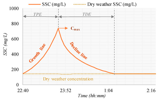 This formulation was originally developed for urban runoff during combined sewer overflows. The SSC curve during storm events is calculated from statistical indices. The first step is to calculate the following variables from the 27 storm events: the dry weather period between storm events, DWP (day); time to peak of the hydrograph measured from the time where the flowrate exceeds the critical flowrate proposed [11], TPH (day); time to peak of the SSC measured data, TPE (days), in each flooding event; maximum flowrate of each flood event, Qmax (m3/s); maximum SSC concentration measured in each event, Cmax (mg/L); time from the peak of the SSC curve to the end of the curve, TDE (day); and C0 dry weather concentration (mg/L). The next step is the adjustment of three linear regressions that relate the variables Cmax, TPE, and TDE with the hydraulic variables measured in the 27 available storm events: TPH, Qmax, and DWP. Once this is achieved, the SSC curve is constructed from these three points, as presented in Figure 4, using additional growth and decline curves.