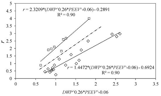 In this model, to adjust the measured SSC values and the fine sediments eroded from the bed, the r parameter of sediment availability in the bed storage is studied and proposed as a variable, which is different to the original model [2]. This r parameter was adopted as a variable with the intention of achieving the same eroded volume in each storm event as the measured volume. This gave rise to different values of the parameter r for each event. When representing this as a function of the dry weather period, DWP, and the previous event eroded volume, PEEV, it is observed that the value adopted by r shows two trends, that of Equation (10) in the case of high peaks of flow, or when a very low DWP is accompanied by a high value of PEEV for Equation (11):