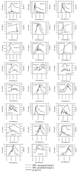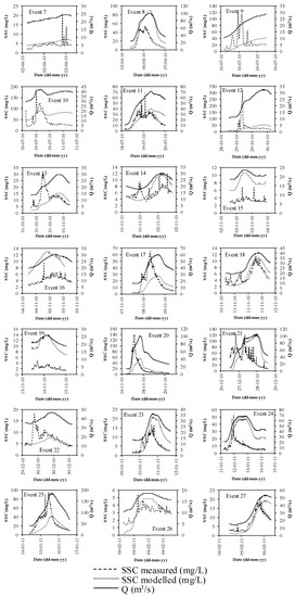 Figure 11 presents the 27 storm events considered, where the measured and calculated SSC values for the shear stress-based model can be observed.