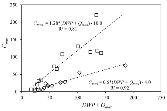 In this model, three linear regressions are presented in Figure 7 and Figure 8 that relate the variables Cmax, TPE, and TDE to the hydraulic variables measured in the 27 available storm events: TPH, Qmax, and DWP. The adjustment in the case of Cmax is presented in Equations (12) and (13) and in Figure 7. Two different trends are observed, representing the different behavior of fine sediment erosion in the studied events, where Equation (13) is related to higher peaks of flow and DWP. Further studies are needed for a better understanding of both trends that could be related to the availability and consolidation of fine sediment coming from the bed and the bank through the year:
