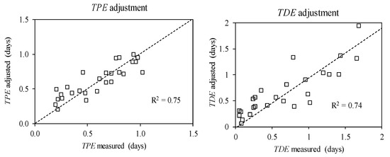 Goodness of adjustment of the time to peak of the suspended sediment concentration (SSC) measured data (TPE) and time from the peak of the SSC curve to the end of the curve (TDE) in the Garcia et al. [3,4] modified model.
