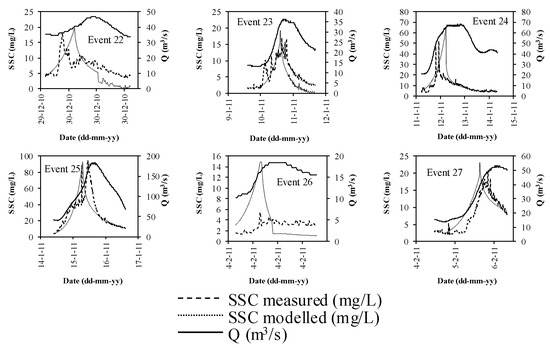 The variables a and b are in agreement with previous work undertaken on the River Bandon [8]. The r parameter is approximately in the 0.1 to 4 range. Figure 6 presents the 27 storm events considered, where the measured and calculated SSC values can be observed.