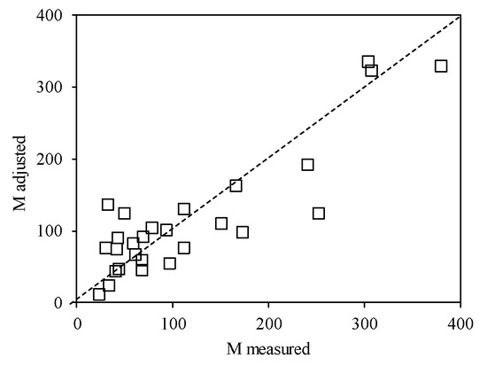 This model is adjusted with an M parameter expressed in mg/m2/hour. Equation (16) includes the DWP, PEEV, and TPH, which are used for adjustment of the M parameter. Figure 10 presents the goodness of fit for the adjustment of the M parameter.