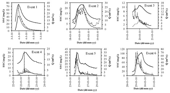 In general, the SSCs modeled with the Vansickle and Beschta [2] modified model present quite good agreement with the measured values. It can be observed that for almost all the modeled storm events, the trend of the SSC measured is predicted by the modeled data and some of the modeled event results correspond with the shape and with the SSC measured concentrations. Differences for some events presented through Figure 6 associated with high flows may be explained by an increase in bank erosion that finishes being transported as suspended sediment, as stated in [12]. Differences in erosion for similar events may be explained by differences in the consolidation of the fine sediment in the bed stream. To confirm these preliminary conclusions, it is recommended that field experimental campaigns of the fine sediments of the bed of the river be undertaken.