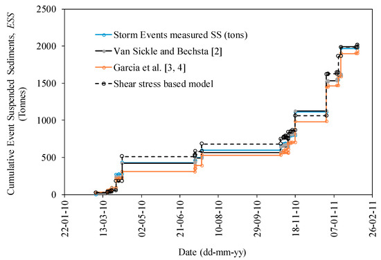 Figure 12 presents the cumulative event suspended sediment, ESS, in tons for the period of study for all 27 storm events. It may be concluded that, in general, all the models proposed at the annual scale are able to reproduce the measured values of SSC for the storm events.