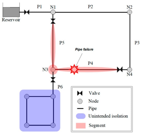 Jun, et al. [] developed a method for practically estimating the damage extent by combining the concept of “segment” suggested by Walski [] and the new concept of unintended isolation. Walski [] characterized a segment as a part of a WDS which should be confined by adjacent on-off valves to repair a broken pipe. For example, as presented in Figure 1, when pipe P4 fails, the segment consisting of pipes P5, P4 and node N3 is blocked by the three on-off valves, and accordingly, water supply on node N4 is suspended. In addition to the segment that is intentionally isolated for repairing pipe P4, other parts of the network might be additionally unlinked from the source according to the network topology. Jun, Loganathan, Kim and Park [] defined such parts as unintended isolation and developed a graph theory-based searching algorithm when a pipe is broken in the network.