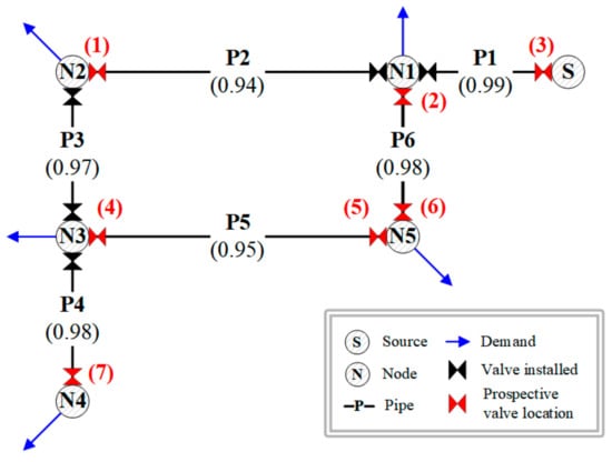 Figure 2 shows an example network where there are seven prospective locations, (1)–(7), for valve installation, and each pipe has different reliability, 0.94–0.99, respectively as presented for each pipe. For simplicity, we considered adding one or two valves and defined the unit cost for installing a valve to be 1 (unitless). Thus, Table 1 shows WDS reliability evaluated by various combinations of valve installation, where Case 1 presents the original status of the network. Here, the WDS reliability was calculated through the success mode approach expressed by Equation (1). For example, 0.903, the value for case 2, is the product of the reliability of the pipes in minimum cut-sets (P1, P4, P5 and P6), i.e., 0.903 = 0.99 × 0.98 × 0.95 × 0.98.
