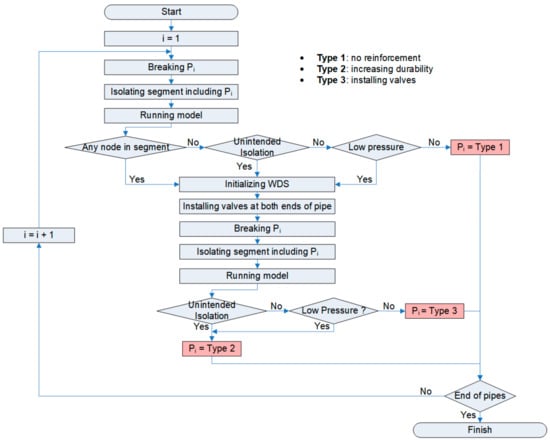 Based on the criteria described in Section 2.2.1, two methods can be generally considered for improving the WDS reliability: increasing pipe durability and installing valve(s), by which this study proposes three reinforcement types; types 1–3 according to the flow chart presented in Figure 3.