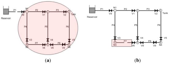Two example cases of damage extent by pipe failures, (a) case 1 by failure of P1 and (b) case 2 by failure of P7, where P: pipe; N: node; V: valve.
