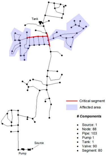 In this regard, there have been generally two types of methods for estimating the WDS reliability, which are connectivity/topological and hydraulic reliability-based approaches []. In the former case, Tung [] introduced six techniques including event tree, cut-set, tie-set, conditional probability and fault-tree methods, and presented that the cut-set method is most effective in estimating the system reliability. Wagner, et al. [] presented an analytical method to calculate reachability and connectivity, where reachability of a demand node indicates a circumstance in which the node is connected to no less than one source, and connectivity represents that every demand node links to at least one source in the WDS. However, it was noted that calculating the two metrics is fairly applicable to medium-sized networks. Similarly, Yazdani and Jeffrey [] evaluated the structure and vulnerability of WDSs using a complex network theory regarding a WDS as a graph consisting of links and nodes. On the other hand, the hydraulic reliability-based approach focuses on evaluating how well the system supplies water under various conditions through hydraulic simulations. Su, Mays, Duan and Lansey [] proposed a method to estimate the system reliability based on minimum cut-sets. The minimum set of system components causing system failures (e.g., low pressure and suspension of water supply) when destroyed, which is experimentally determined by checking if any system failures happen through multiple hydraulic simulations by removing one or more system parts (e.g., pipe). Wagner, et al. [] suggested using both analytical and simulation methods together for better assessments of WDS reliability based on simulation results over two WDSs. For this, Jun, et al. [] suggested a compositive method to estimate the WDS reliability by determining minimum cut-sets of a WDS through the concept of unintended isolation by adopting the concept of segment suggested by Walski [], representing practical damage extent resulting from pipe failures. PieTrucha-urbaniK and Studziński [] conducted a case study to identify the extent of damage (i.e., water suspension and pressure changes) through hydraulic simulations with component failures in WDSs; which in turn led to studies analyzing risks due to pipe failures in WDSs [,].