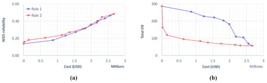 Results of applying rules 1 and 2 in terms of (a) cost—WDS reliability and (b) cost—EN, where EN: expected number of customers out of service.