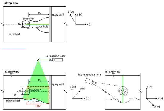 The experiments were conducted in a straight flume that is 11 m long, 0.6 m wide, and 0.7 m deep, in the Hydraulic Modeling Laboratory, Nanyang Technological University. The glass-sided flume walls enabled optical observations through the use of PIV techniques. The test section was located at a distance of 7 m downstream from the flume entrance. A five-bladed propeller with an overall diameter of Dp = 7.5 cm and a hub diameter of Dh = 1.0 cm was used in this study. The propeller rig was mounted on an appropriately designed movable carriage that spanned transversely across the flume and could be moved along the longitudinal rail installed on the sidewalls of the flume. In this way, the propeller was able to operate at different clearances from the model quay wall, namely the wall clearance Xw, which is defined as the longitudinal distance between the propeller face and vertical wall. The quay model located downstream of the propeller was built using an acrylic plate with a dimension of 60 cm (height = water level) × 60 cm (width = flume width) × 2 cm (thickness). A 10 cm thick sand bed with uniform sediment of d50 (=0.45 mm) was placed on the bottom of the flume. The still water depth above the sand bed was 0.5 m, which is reasonably deep, such that the effect of the free surface is negligible. Before the commencement of each test, the sand bed was carefully prepared and leveled to minimize the compaction difference among different test runs. The experimental setup is shown in Figure 1, in which a right-handed coordinate system (o-xyz) is adopted, with the origin located at the undisturbed bed level and directly beneath the propeller face plane. The x-axis is streamwise-oriented along the bottom centerline, the y-axis spanwise-oriented toward the starboard, and the z-axis along the upward vertical. Accordingly, the mean velocity components in the direction of (x, y, z) are represented by (u, v, w). The PIV system comprised a 5-W air-cooling laser with a wavelength of 532 nm as the light source and a high-speed camera. The laser was placed on top of the flume and the beam emitted from the laser source passed through the optics, resulting in a laser light fan of 1.5 mm thickness being cast down into the water. The laser sheet was set to align with the propeller axis of rotation, which is in the vertical plane of symmetry of the flume (see Figure 1a). In this way, the streamwise flow data were collected from the sectional view of the jet central plane (see Figure 1b). Meanwhile, using GetData Graph Digitizer Software, the centerline scour profile was determined from the illuminated line where the laser sheet intersects the sand bed. The high-speed camera used (Phantom Miro 320 with Nikkor 50 mm f/1.4 lens) had a maximum resolution of 1920 × 1200 pixels, 12-bit depth, and more than 1200 frames per second (fps) sampling rate. A sampling rate of 300 fps was used in this study to ensure that the particle displacement was within 50% overlap between adjacent interrogation windows for cross-correlation analyses. Aluminium particles with d50 of 10 μm and specific density of 2.7 were used as seeding particles. The settling velocity of the aluminium particles was estimated to be 92.6 μm/s using Stoke’s law, which is negligible compared with the propeller jet velocity. The same particle has been extensively used in previous studies (e.g., Lin et al. [], Hsieh et al. [] and Wei et al. []) and validated as a satisfactory seeding particle in PIV applications.