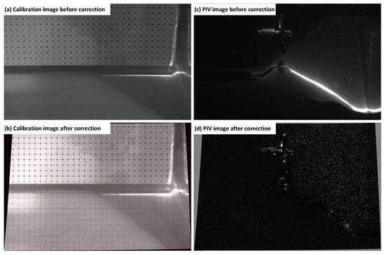 For a three-dimensional scour hole induced by a propeller jet, one may find it difficult to capture the flow field within the scour hole, since the lateral sediment deposition could block the optical access in a normal PIV operation where the camera is 90° to the laser sheet. For this reason, Wei and Chiew [] adopted an oblique particle image velocimetry (OPIV) method, in which the camera was tilted with a depression angle, and thus could capture a complete view of the flow field inside the scour hole. By performing an image correction procedure, their error analysis confirmed a reasonable accuracy of the OPIV method in measuring the flow field within a developing three-dimensional scour hole. Guan et al. [] have also successfully applied the same protocol for measuring the horseshoe vortex evolution of a pier-scour hole. By following a similar approach as in those studies, the camera in this study was set at a depression angle of 20° to cover a rectangular field of view (FOV) in front of the quay wall as shown in Figure 1b,c. To ensure that the entire FOV was in focus, the lens aperture was set to f = 5.6 to achieve a sufficient depth of field for the oblique viewing. Before capturing the particle seeded flow field, a calibration plate (with a regularly spaced grid of markers) was placed at the position of the laser sheet in still water, and a calibration image was obtained as shown in Figure 2a, which shows that the coordinates of the markers were distorted from their actual positions due to the oblique viewing. To correct this distortion, a third-order polynomial transformation function was employed, in which the calibration coefficients were obtained by fitting the position of the distorted dots to the regular grid as shown in Figure 2b. Thereafter, the same calibration parameters were applied to correct all the raw PIV images during the postprocessing stage. A comparison of sample images before and after correction is exemplified in Figure 2c,d. In addition, a Butterworth high pass filter [] was applied to filter out undesirable light reflections (low-frequency) and highlight the seeding particles (high-frequency), as illustrated in Figure 2c,d. The velocity vector fields were then calculated by using the Davis 8.4.0 software, in which a multi-pass iteration process was adopted with the interrogation windows starting from 64 × 64 pixels to 32 × 32 pixels.
