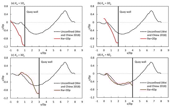 Comparison of asymptotic scour profiles between unconfined and confined cases: (a) Xw = 1Dp; (b) Xw = 2Dp; (c) Xw = 3Dp; (d) Xw = 4Dp.
