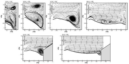 To examine the underlying mechanism associated with the observed scour characteristics at different wall clearances, it is useful at this stage to qualitatively discuss the features of the flow pattern within an asymptotic scour hole, which is most explicitly described in the streamline plots as shown in Figure 4. Corresponding to Figure 3, Figure 4a–d depict a comparison of the results obtained in the present study for the four wall clearances, Xw = 1Dp, 2Dp, 3Dp, and 4Dp. Additionally, Figure 4e,f, which present the flow fields around two typical open quay cases with toe clearances of Xt = 2Dp and 4Dp, are also included in the figure for illustrating the effect of the type of quay. Please note that the open quay cases were conducted by Wei and Chiew [] under the same test conditions (e.g., propeller configurations, bed material, etc.) as those in the current study but with an inclining quay.