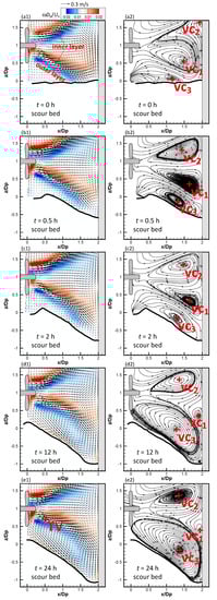 As the scour hole evolves, it is interesting to note that the shear layer structure associated with the spread-out jet streams seems to be constant and steady during the entire scouring process, although the developing scour hole, to some extent, allows the lower stream to be expanded farther downwards (Figure 5b1,e1). It therefore can be concluded that the presence and development of the scour hole have little impact on the spread-out flow structure, which primarily is dependent on the wall effect. In contrast, the streamline plots on the right column of Figure 5 depicts a considerable variation in the overall structure of the vortex system from the initial to asymptotic state. Specifically, at the initial instant of t = 0, Figure 5a2 shows that the presence of the flatbed prevents the formation of the downward flow, which would otherwise occur when the lower stream impinges on the vertical wall in the absence of the bed. Instead, a strong upward flow can be found along the vertical wall, which enhances the strength of V1 and squeezes V2 to the upper right corner of the FOV. On the other side, V3 is still in its embryonic phase. Thus, one could surmise that at the initial instant, it is V1 that is the driving force for the onset of scouring, during which the bed sediment particles are entrained in a counter-clockwise manner and transported to the lateral sides by the vortex tube formed in front of the wall. As soon as an initial local scour hole is excavated around the base of the quay wall, the original “confinement effect” associated with the flatbed diminishes, allowing the jet flow (lower stream) to be deflected downwards along the wall. As a result, a clockwise vortex is expected to be formed inside the scour hole. This is exactly what is shown at the subsequent time of t = 0.5 h in Figure 5b2, in which a well-established V3 is present, resembling the horseshoe vortex in a pier scour hole. This vortex, in turn, facilitates the subsequent scouring process, during which the bed sediment would be driven to the upstream by the clockwise flow, finally depositing at the upstream of the propeller or being carried away with the oncoming jet flow. Meanwhile, Figure 5b2 also shows that without the effect of the previously observed upward flow at t = 0 h, V1 and V2 appear to be quasi-symmetrical about the propeller axis, similar to those observed by Wei and Chiew []. From then on, Figure 5b2–e2 simply show that V3 is exclusively responsible for the scouring action, during which the sediments are swept in the clockwise fashion from the bed bottom and carried upstream largely in the form of bedload (visual observation). More interestingly, the enlargement of the scour hole does not support a further development of V1 and V2 as one could have envisioned. On the contrary, the enhancement of the primary vortex (V3) within the scour hole appears to overwhelm the growth of V1 and V2. In particular, V1 exhibits an evident shrinking trend from t = 0.5 h to t = 12 h, while V2 seems to be able to maintain its size. Thereafter, the vortex system appears to be stabilized by the presence of the large scour hole. At t = 24 h, both the size and position of all the three vortices are found to reach an asymptotic state when the scouring process ceases.