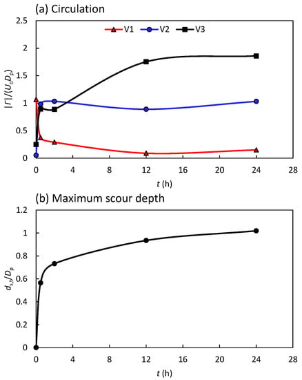 where A is the enclosed area of the vortex. In this study, the vortex center and boundary were determined by using the vortex identification algorithms developed by Graftieaux et al. []. The so-obtained coordinates of the vortex centers confirm a reasonable agreement with those inferred from the visualized vortices shown in the streamline plots (see VC1, VC2, and VC3 in the right column of Figure 5). It is also noted that both V2 and V3 exhibit a clockwise rotation (negative circulation). To compare their relative strength with V1, Figure 6a shows the absolute value of their magnitudes. For easy reference, the temporal development of the maximum scour depth (ds,t) is also plotted against time in Figure 6b.
