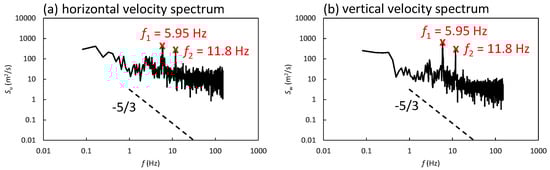 Power spectra of horizontal and vertical velocity fluctuations at a typical point of tip vortex shedding (x = 0.5Dp, z =0.7Dp) at Xw = 2Dp.