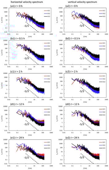 Power spectra of horizontal and vertical velocity fluctuations at vortex core centers of VC1, VC2, and VC3 at Xw = 2Dp: (a1,a2) t = 0 h; (b1,b2) t = 0.5 h; (c1,c2) t = 2 h; (d1,d2) t = 12 h; (e1,e2) t = 24 h.